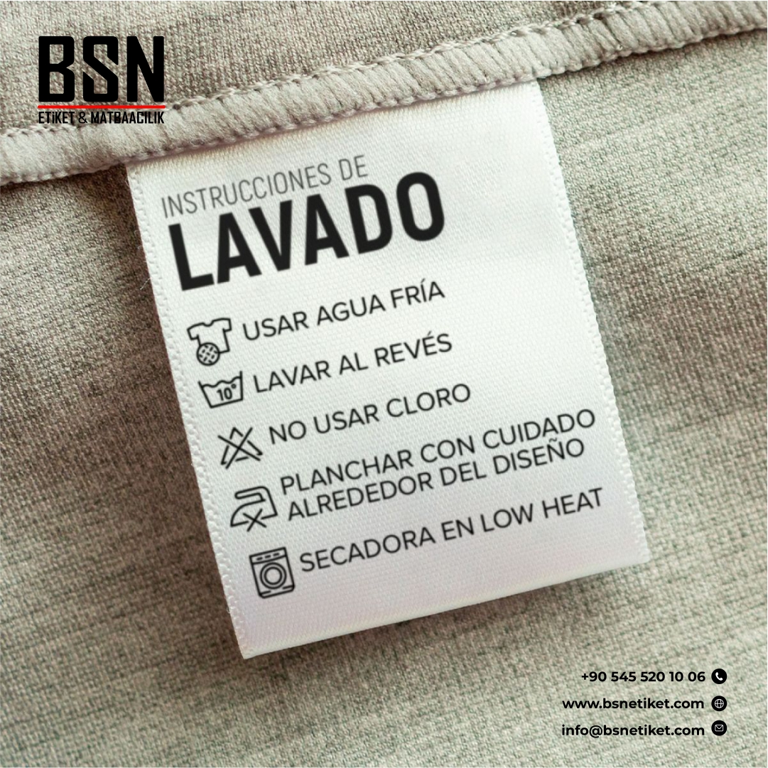 • Yıkama Talimatı; satın alınacak veya kullanılacak ürün ile alakalı içerik bilgilerini, ürünün nasıl ve kaç derecede yıkanması gerektiğini, nasıl ütülenmesi gerektiğini çeşitli yıkama sembolleri ile veya yazılı bir şekilde müşteriyi bilgilendirmek ya da uyarmak amacıyla kullanılan etiketlerdir. Yıkama talimatının içerisinde üründe kullanılan kumaşın içerik bilgileri ve uyarı yazıları da yer almaktadır. Aynı zamanda logolar, web siteleri ve iletişim bilgileri ile markalama gibi birçok seçenekte kullanılabilir.
